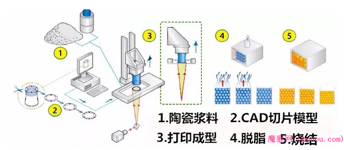 陶瓷件的3D打印包括配置陶瓷漿料、繪制三維模型并分層、3D打印成型、燒結等流程,其無需原胚和模具,就能直接根據計算機圖形數據,通過增加材料的方法生成任何形狀的物體,簡化產品的制造程序,縮短產生的研制周期,提高效率并降低成本。