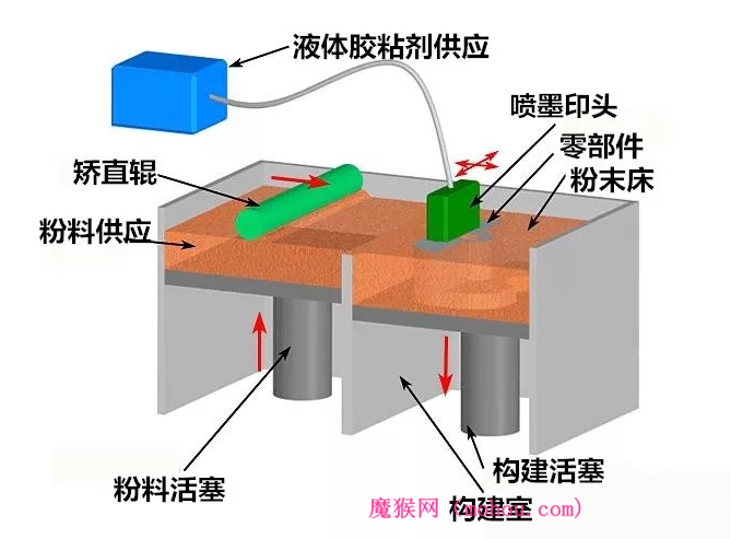 IJP具有成型原理簡單,打印頭成本低,易產業化等優勢;但噴墨打印頭堵塞,另外打印高度受限且不能打印內部多孔結構模型,還要求粉末粒徑分布均勻,流動性好且高溫化學性質穩定。 4三維印刷工藝(3DP) 三維打印是由MIT開發出來的,首先將粉末鋪在工作臺上,通過噴頭把粘結劑噴到選定的區域,將粉末粘結在一起,形成一個層,而后,工作臺下降,填粉后重復上述過程直至做出整個部件。目前,以氧化鋯、鋯英砂、氧化鋁、碳化硅和氧化硅等陶瓷粉體為原材料。